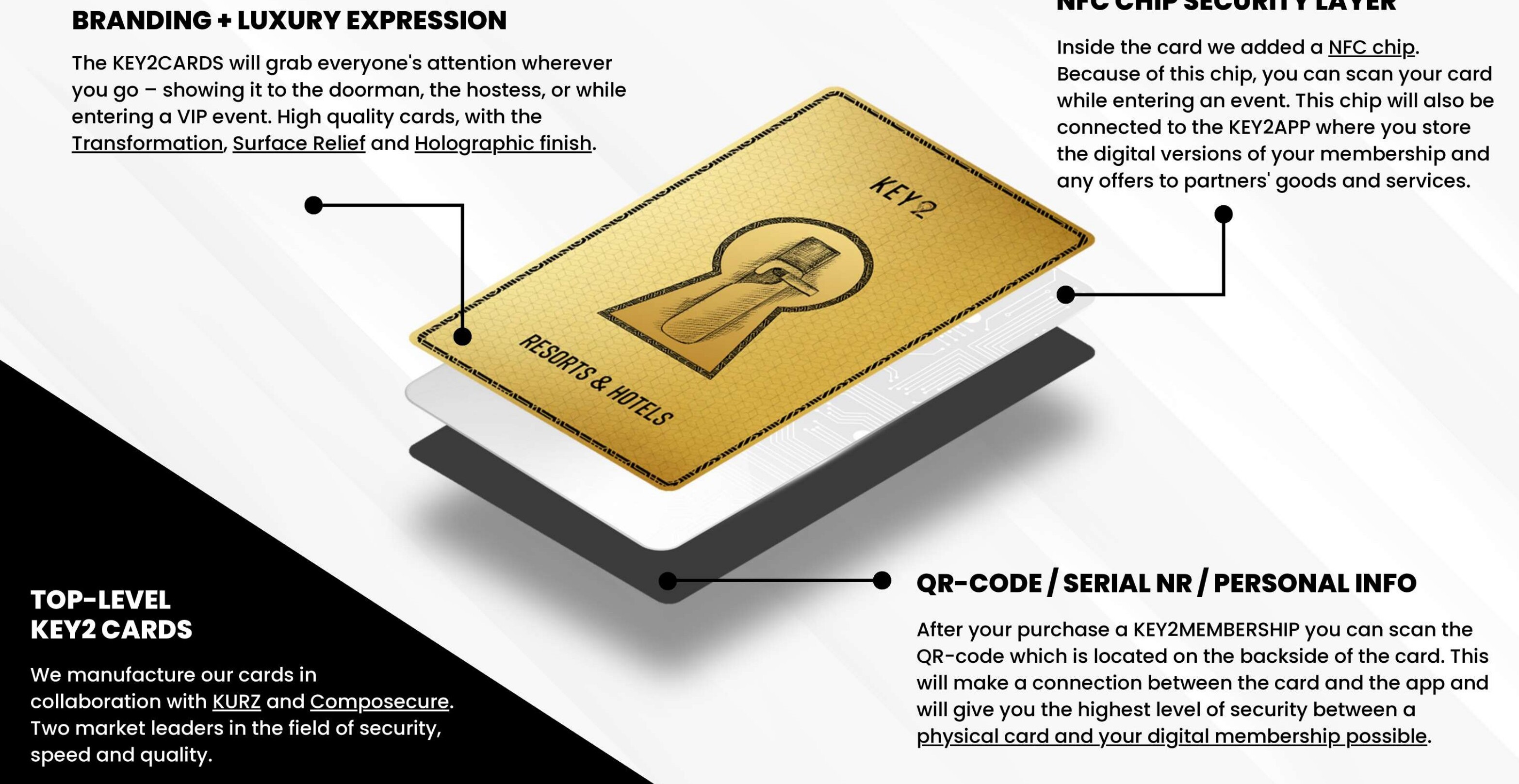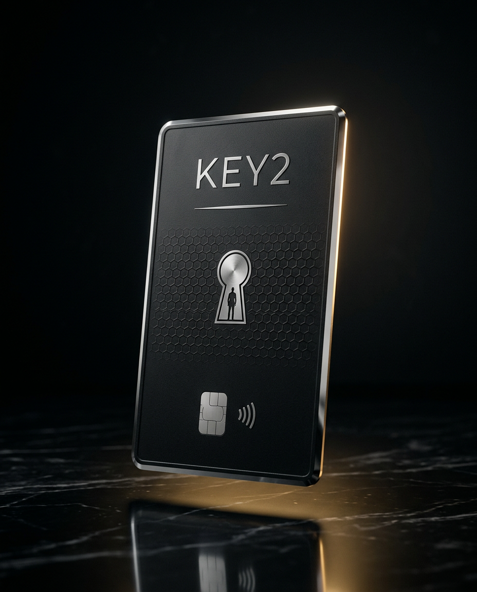 KEY2 is a heavy metal, holographic, NFC-enabled payment card — crafted with KURZ and Composecure for the world's most discerning brands. One tap. Verified. Yours.